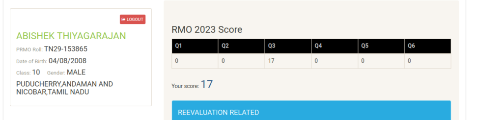 -16 | Math Olympiad 2023 | Qualified for RMO Got 12 in IOQM | 2023 | IOQM – got 12, cutoff 10 RMO – Got 17(0/0/17/0/0/0) . cutoff – 18 | Clickhere, Clickhere(IOQMmark), Clickhere(MeritC),Clickhere(RMOMark) |