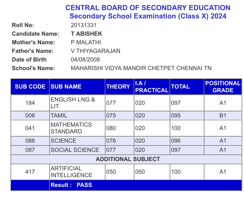 -20 | 10th CBSE Board Exam | Passed | 2024 | – | Result |