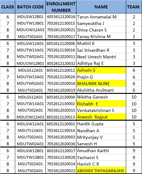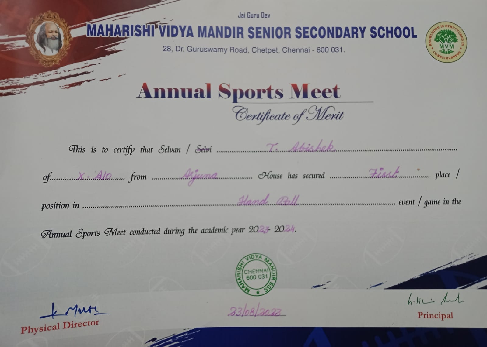 -13 | HANDBALL | Handball Interclass- 1st place team – 9A10 —— Interhouse – 1st place team – arjuna | 2022-23 & 2023-24 | Interclass Match Scores: 1st – Bye 2nd – 7-0 3rd(SF)- 2-1(9A1) Final- 1-0(9A2) | (Clickhere, Clickhere -< Interhouse) |