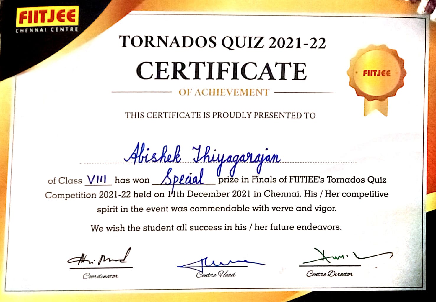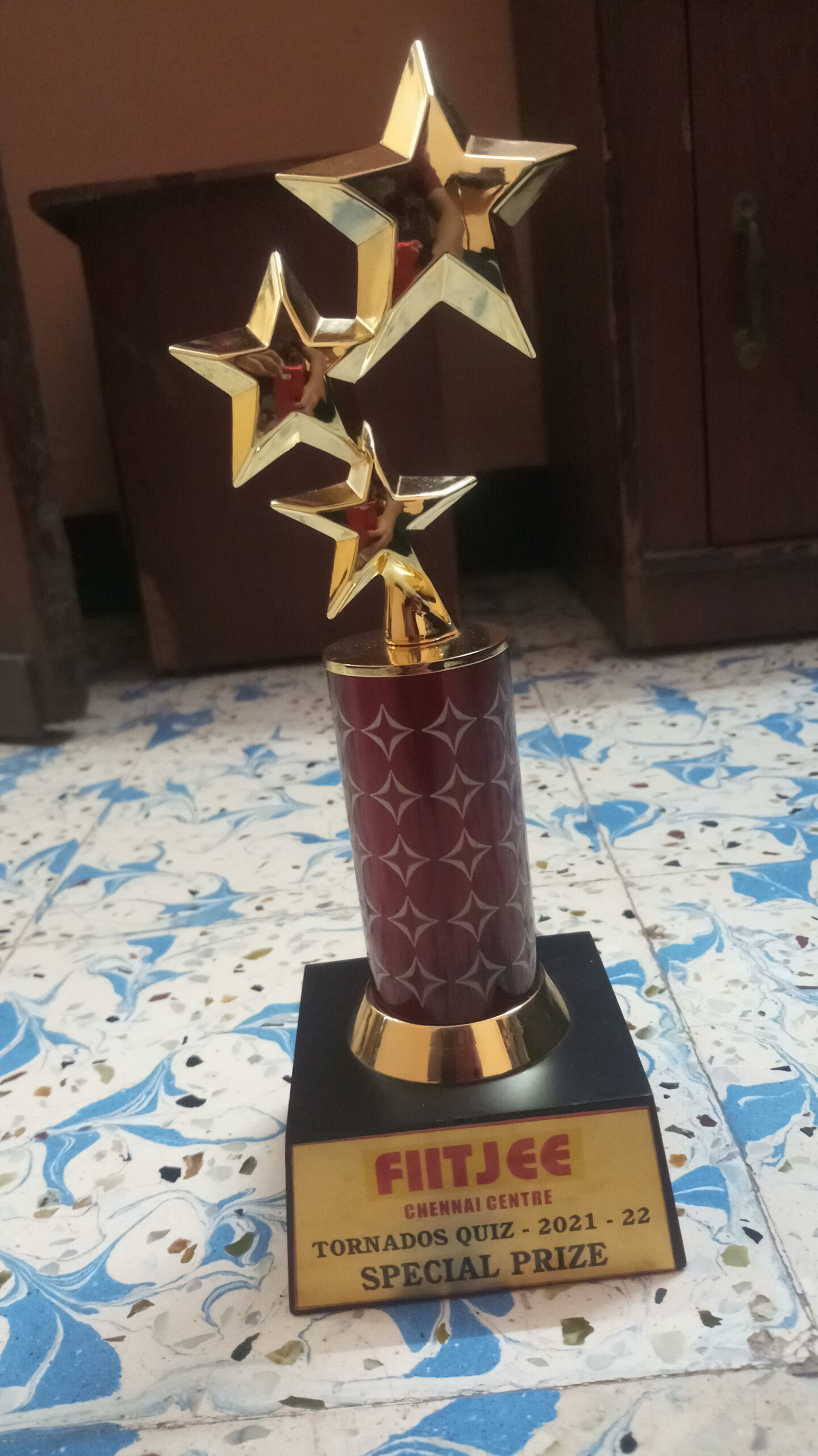 -4 | Tornado Quiz 2021-22 3rd Round | 4th Place – Special Prize winner – Team Quiz | 2021-22 | So I was a replacement as one of the original team members were not coming to attend. Went through FIITJEEE bus from Kilpauk Office. Got 4th place out of 8 teams and received a consolation special prize for the same. Bought a white shirt as for the dress code, but they itself gave a FIITJEE shirt. Drank Pomegranate juice and Dragonfruit juice with Dad. Syallabus were Current Affairs, Science, Anime,GK. | Clickhere,Clickhere,Clickhere,Clickhere,Clickhere |