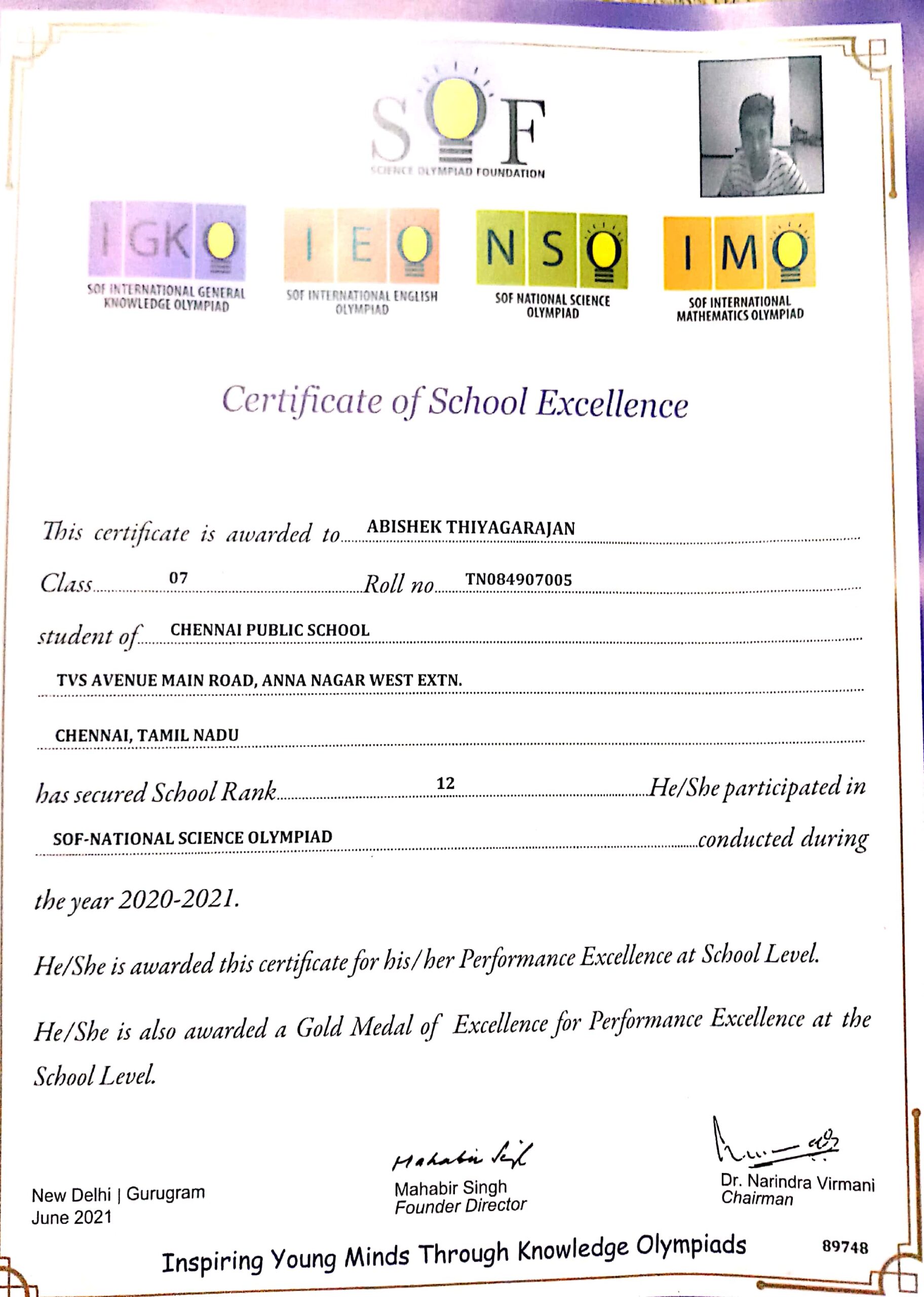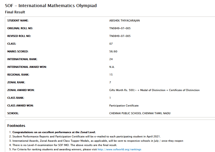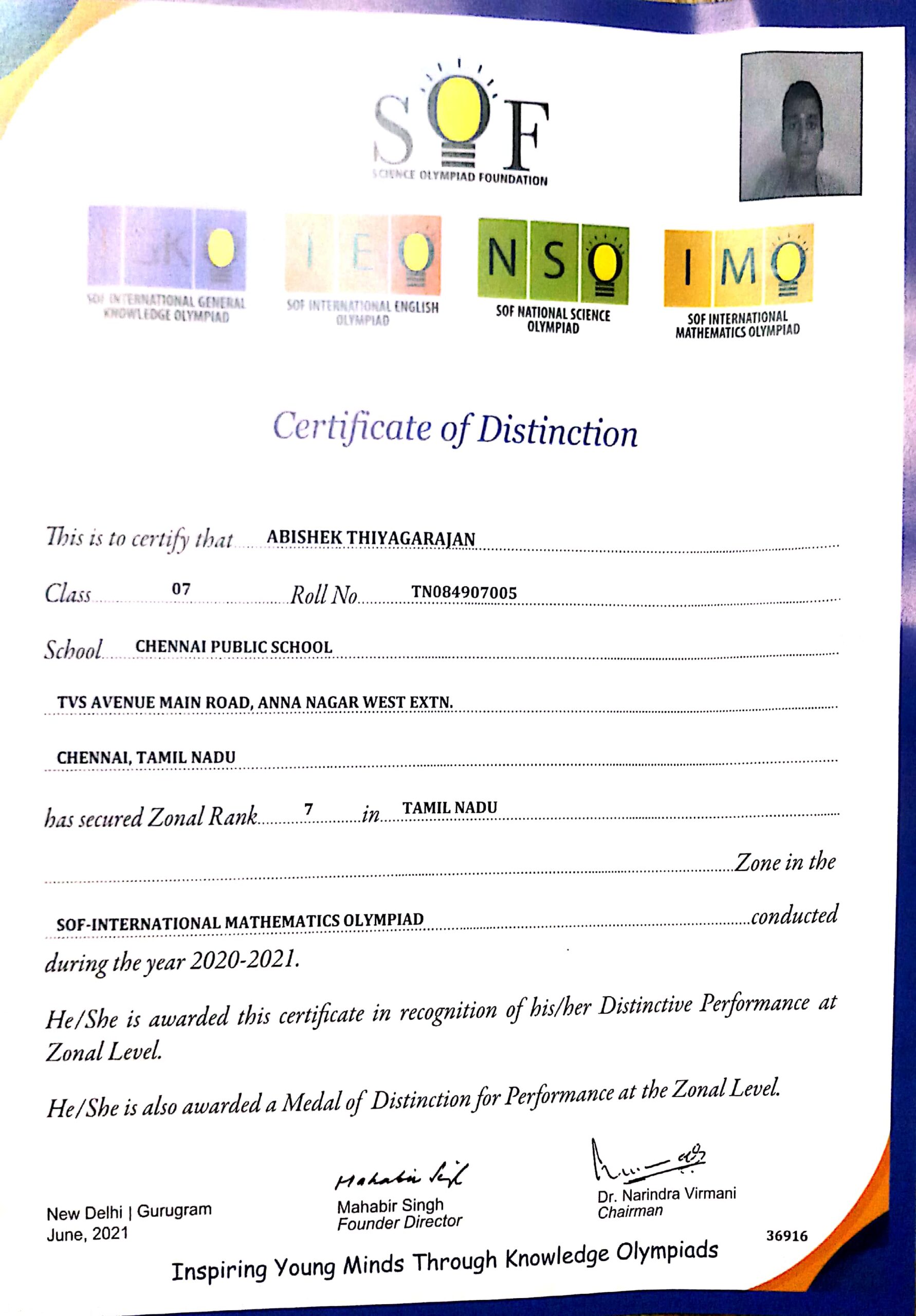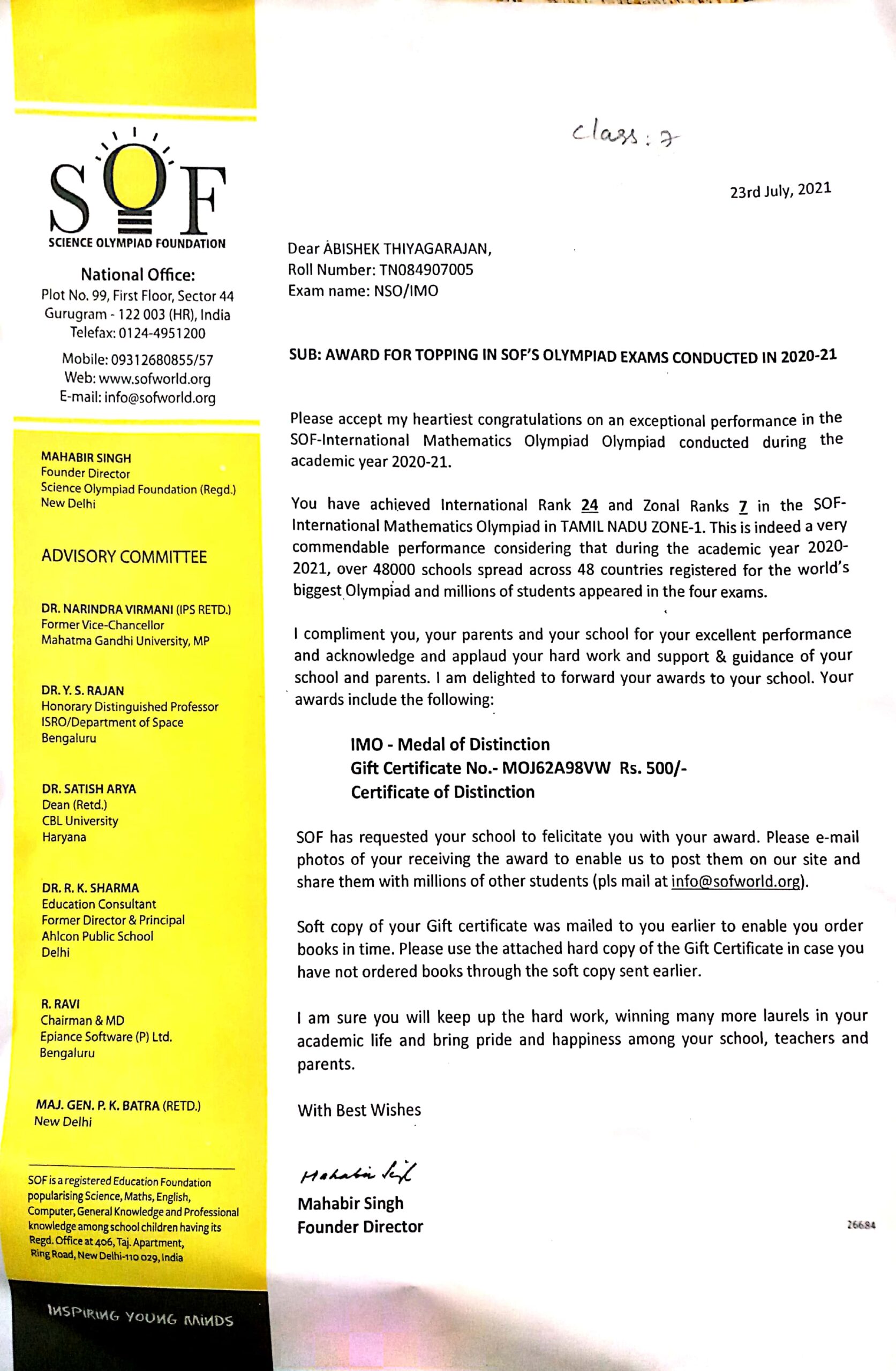 5 | SOF NSO and IMO results | Gold Medal of Distinction in IMO | 2020-2021 | Gold in NSO(7-D topper, class rank 12) and IMO(class rank-1), Zonal Rank 7 in IMO for which ₹500 gift voucher and Medal of Distinction. | Clickhere, Clickhere,Clickhere,Clickhere,Clickhere,Clickhere,Clickhere,Clickhere, Clickhere,Clickhere |