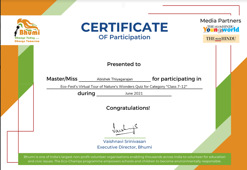 0 | Gift from Bhumi NGO for winning one of their competitions (Virtual Tour of Nature’s Wonders)held in this year’s Eco-fest | I got a F36050 Model Telescope from Bhumi which they ordered on Amazon worth over ₹2500. (Amazon Link) | 2021 | Virtual Tour of Nature’s wonders where they shows two video tours of two places wonders of the earth, the Sahara desert and the Australian bay reef and they asked questions form the video which i answered correctly and won the telescope. | Clickhere, Clickhere, Clickhere, Clickhere(telescope) |