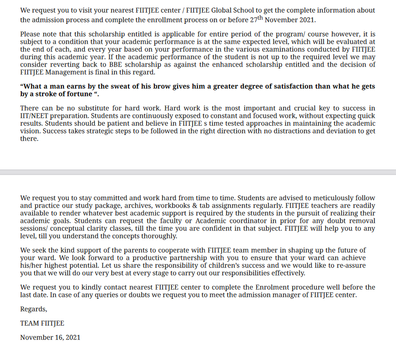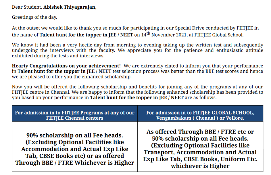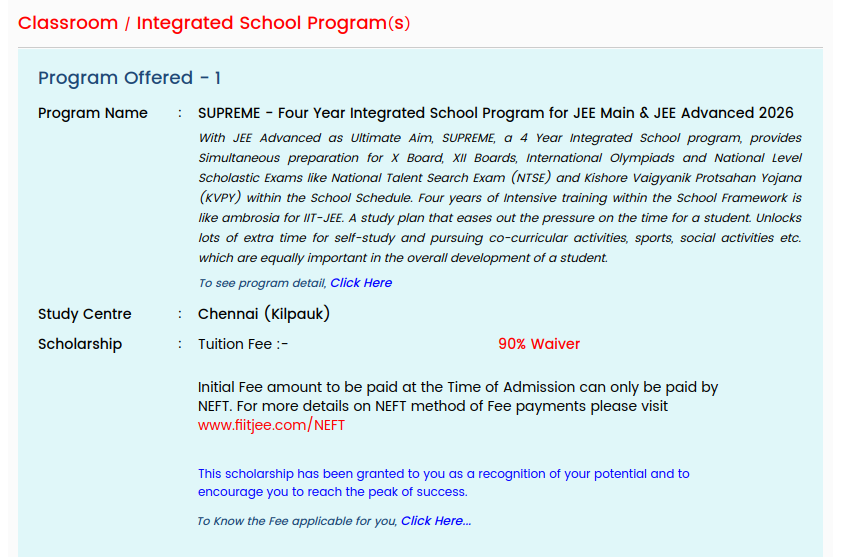 -2 | Talent Hunt_Extra Scholarship Test_Subjective Exam and Interview | 90% scholarship for 9th grade programs on whole fees | 2021 | It was a subjective type exam conducted in FIITJEE Global School. From 9:30 – 4:00 ; Morning subjective exam for 1 and 1/2 hours and then lunch was provided there itself, after that interview for each subject which consisted of paper discussion and few questions related to the chapters. I also discussed regarding my telescope with the school’s teacher. | Clickhere, Clickhere, Clickhere, Clickhere |