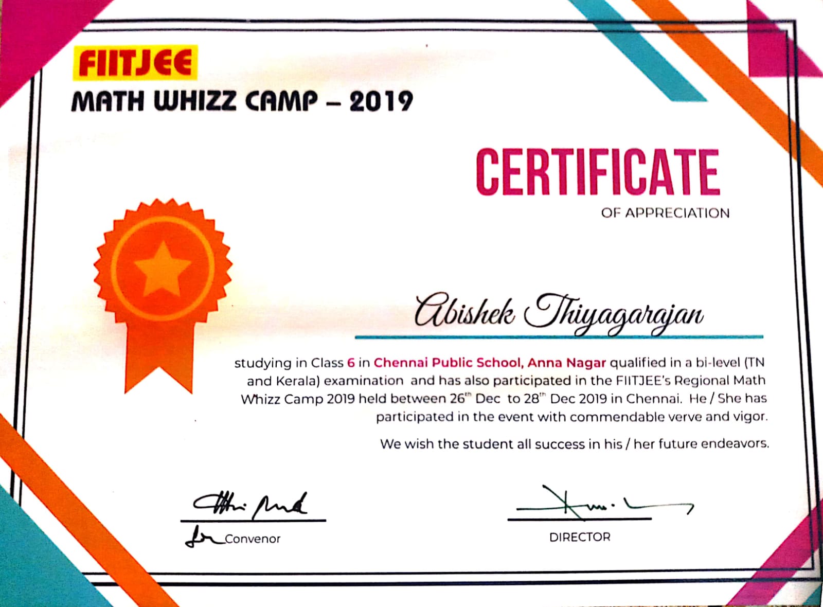 10 | Mathwhizz | 50,000 scholarship for FIITJEE 4 year program | 2019 | Mathwhizz is an Math interstate competition held by FIITJEE. It has 3 stages. 3rd stage was camp for 3 days the first 2 days were lectures and the 3rd day was a test. I got 3rd place in the test and the scholarship.The camp was held in FIITJEE Adyar Hq. | Clickhere, Clickhere |