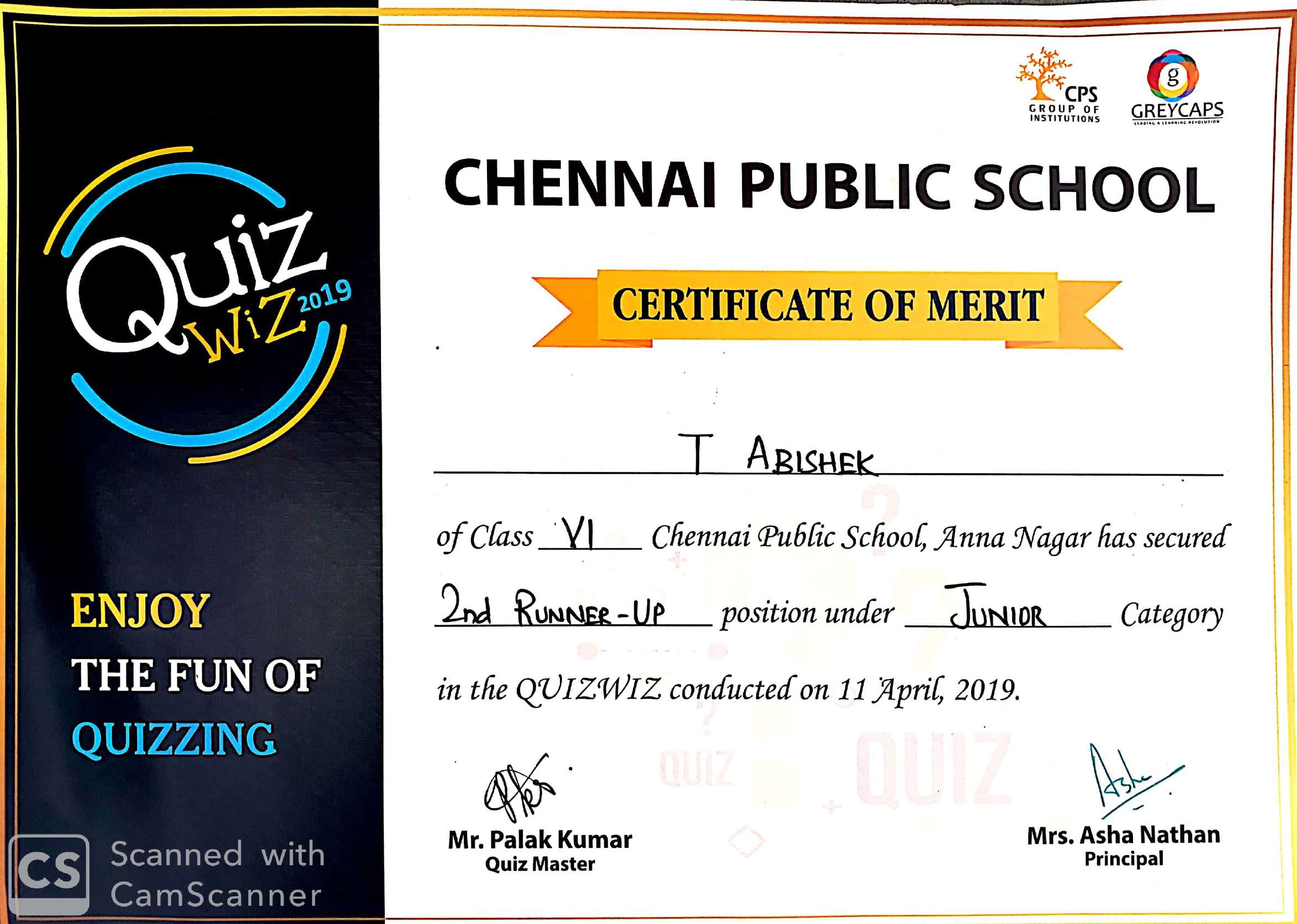 8 | QUIZWIZ | 2nd Runner Up | 2019 | QUIZWIZ is a school-level quiz based on General Knowledge. I also got “The Secret Garden” book as an additional gift. The Quizmaster was Mr. Palak Kumar. | Clickhere,Clickhere1,Clickhere2 |