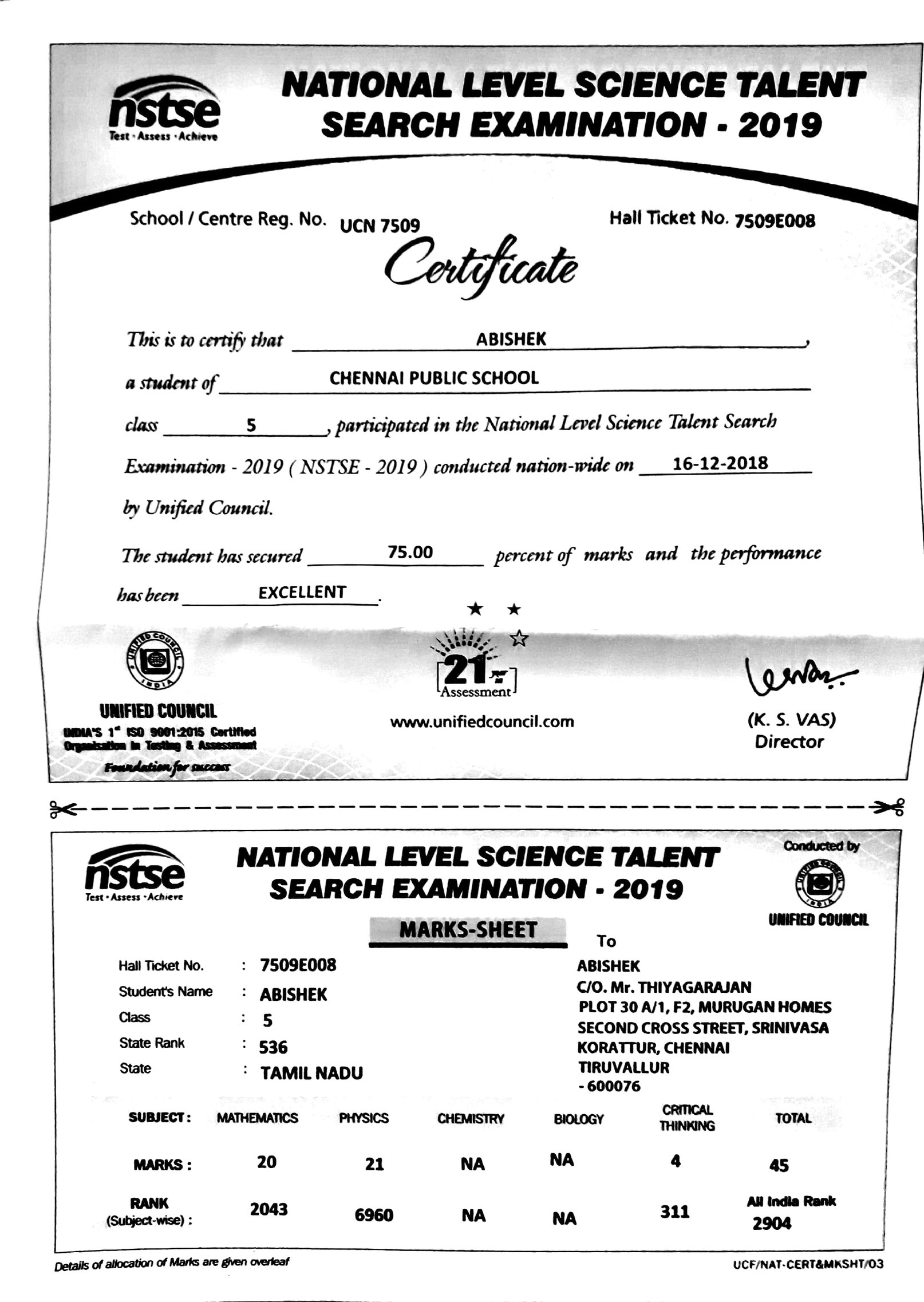 9 | NSTSE Results | All India Rank 2094 | 2019 | NSTSE is a National Level Science Examination. | Clickhere |